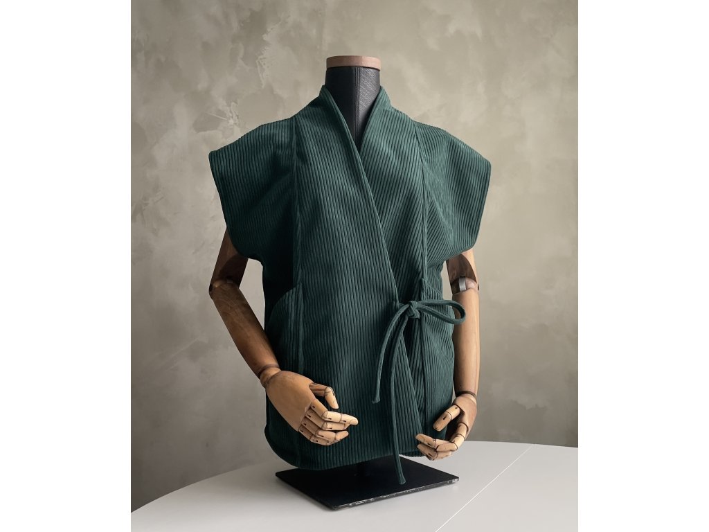 Tmavě zelený pevný manšestr s vnitřní jemnou vrstvou z veluru (není s chlupem) krásně drží tvar.