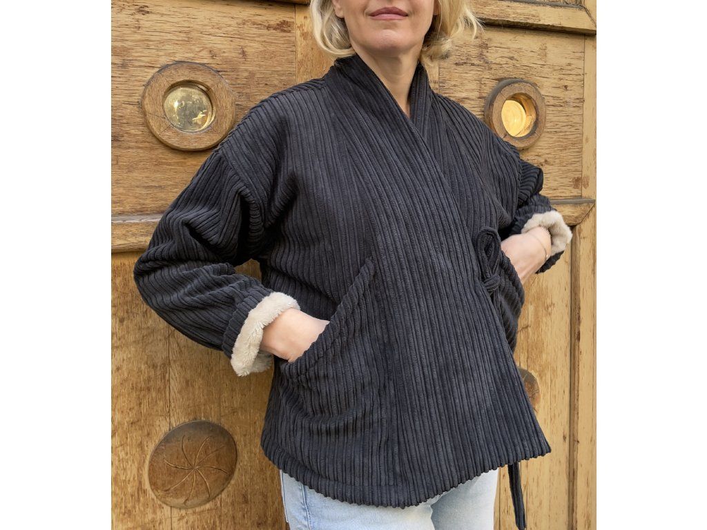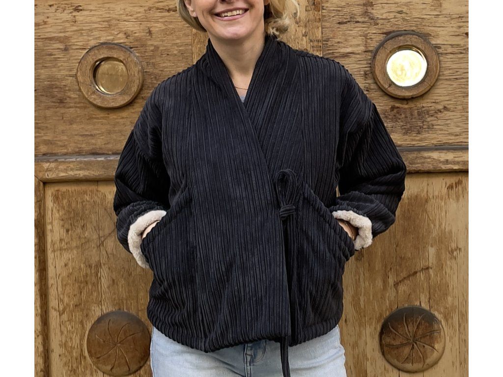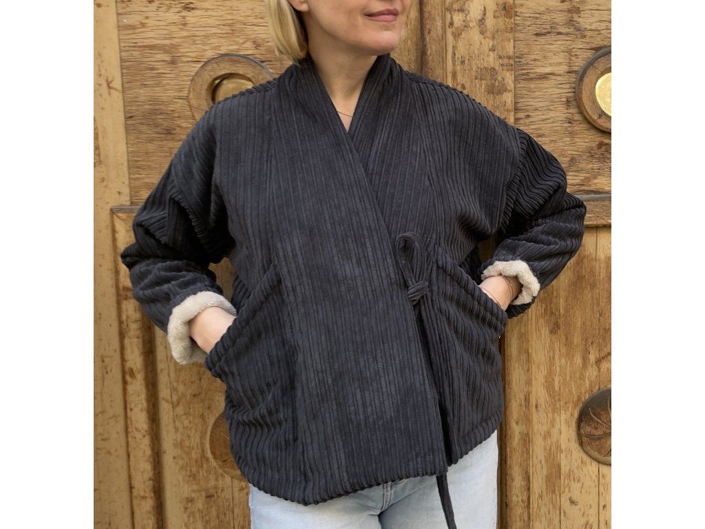 Kabátek z manšestru má zateplenou vnitřní stranu krémovým chloupkem.